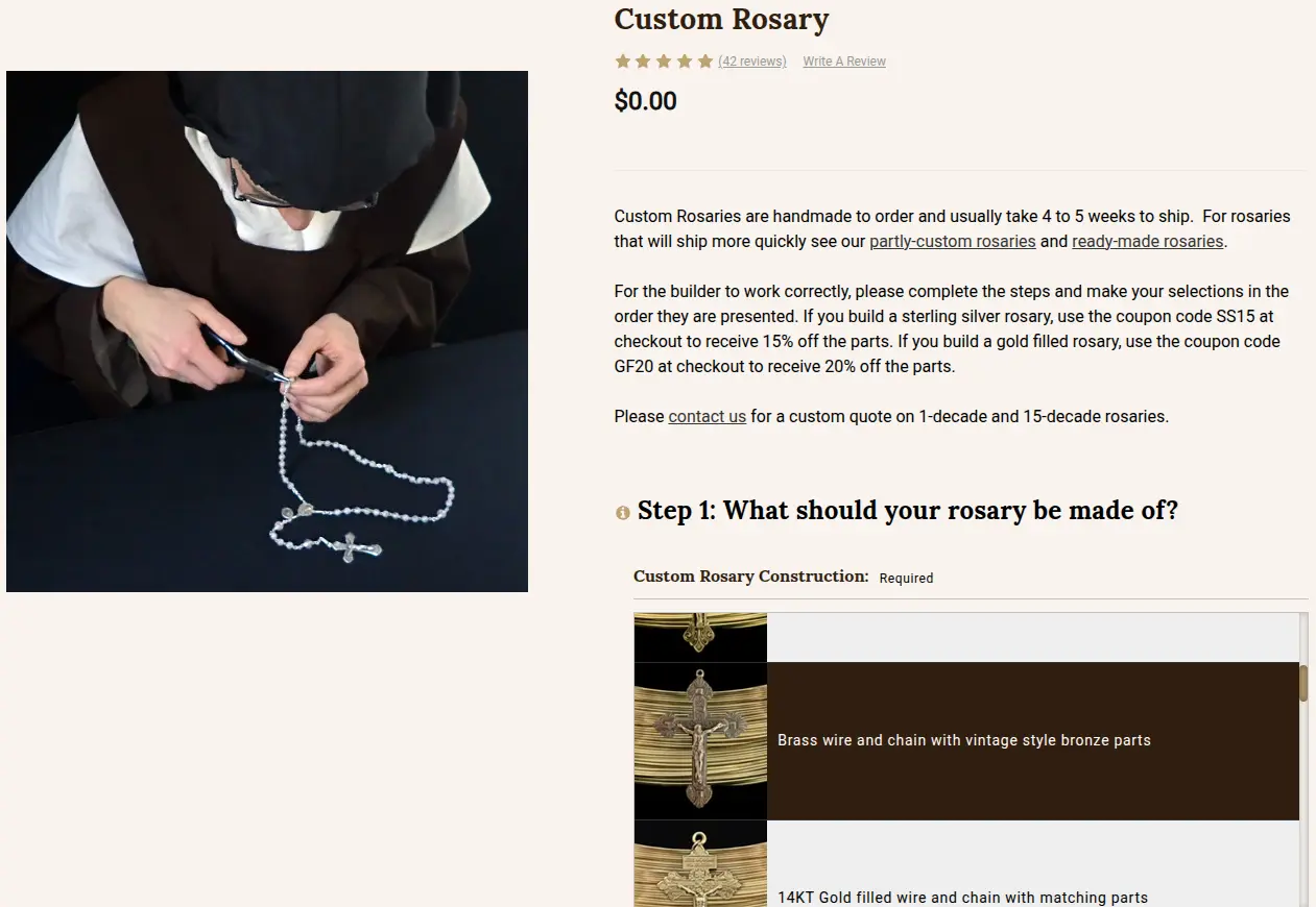 As part of a full site build, the client requested a custom rosary builder with dynamic option selection. Certain rosary components are incompatible or may not match, requiring options to load and unload dynamically based on previous selections. Additionally, each rosary part is a separate product, necessitating real-time inventory tracking.